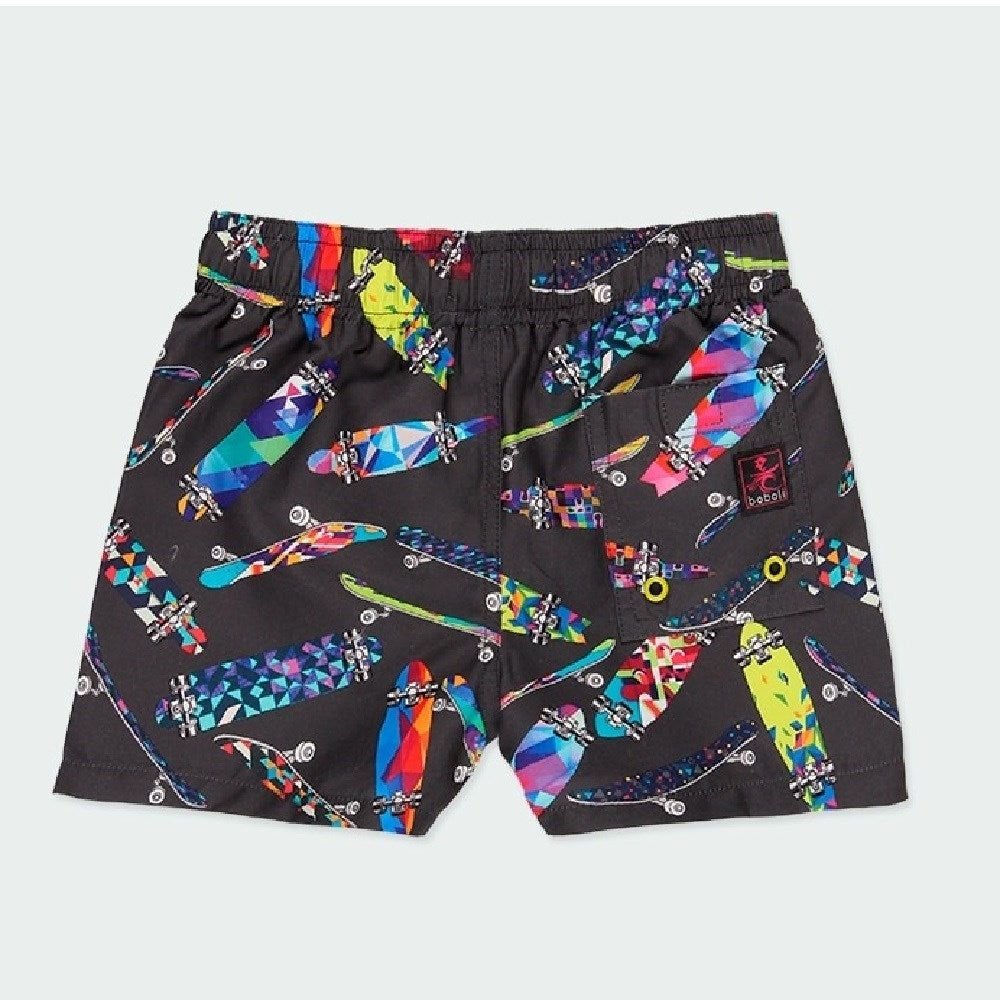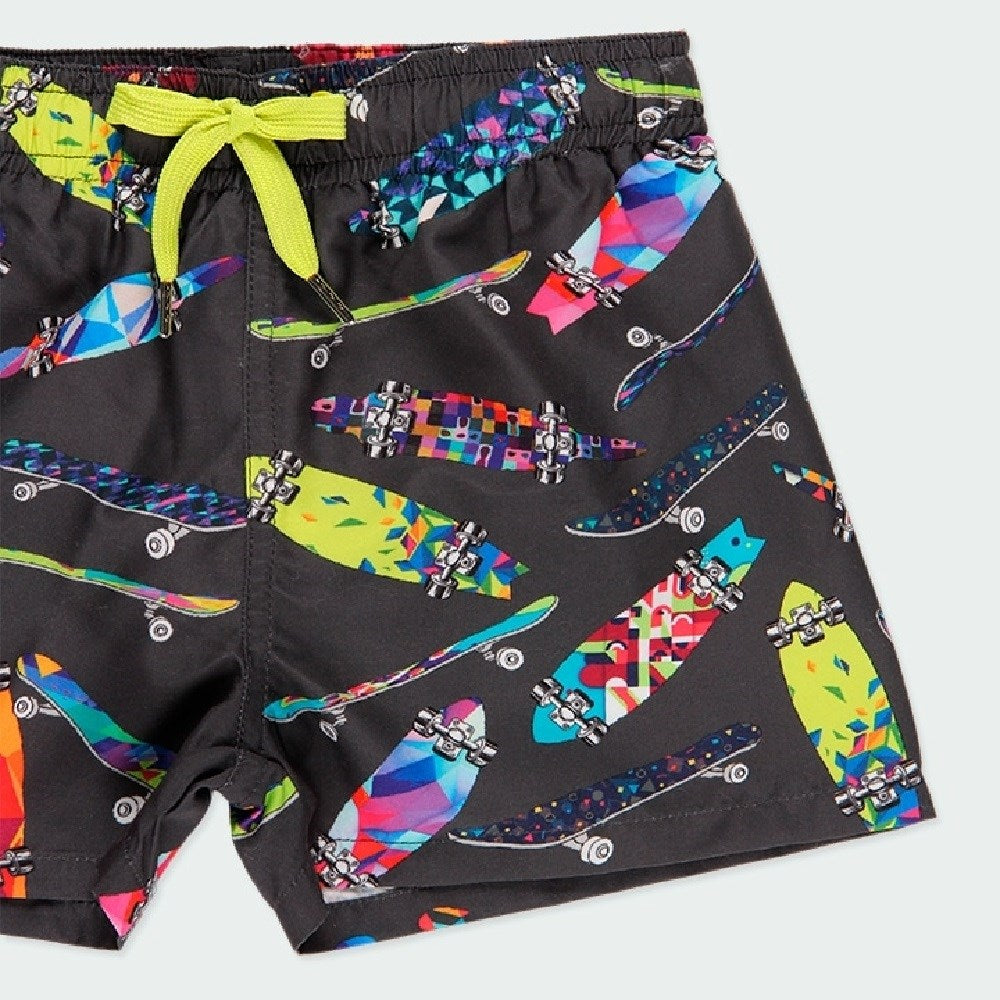 Erkek çocuk kaykay desenli, içi lastikli ve büzgü ipiyle uyum sağlayan baskılı şort, geri dönüştürülmüş kumaştan üretilmiştir.