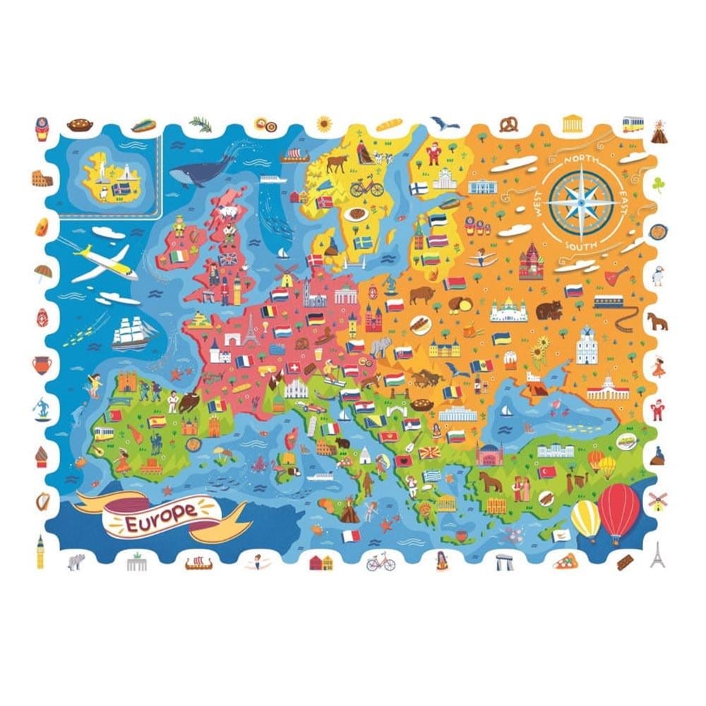 "108 parçadan oluşan bir bulmaca, Avrupa'nın tematik haritası ile her bölgenin karakteristik unsurlarını (anıtlar, yerel yemekler, bitki örtüsü ve fauna) gösterir ve dikkat ve gözlem becerilerini geliştirmek için özel olarak tasarlanmıştır.