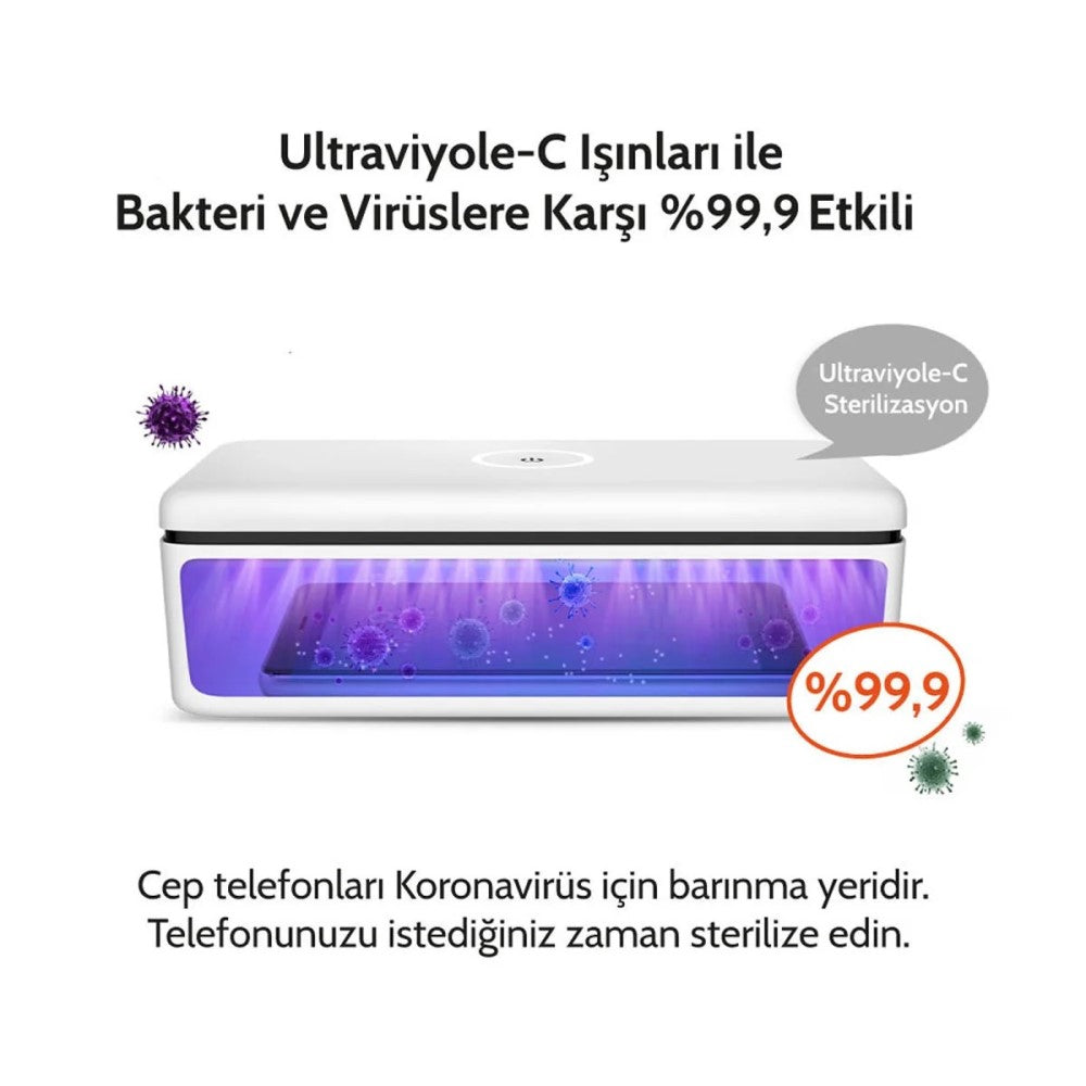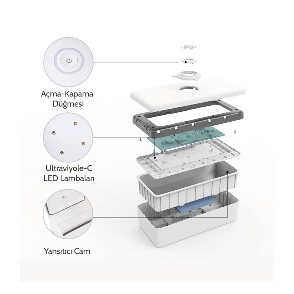 3 Dakikada Etkili Yeni Nesil Hızlı Sterilizasyon Ultraviyole-C LED Teknolojisi ile geliştirilmiş Ultraviyole-C LED Sterilizasyon Kutusu, su ya da mikrodalga olmadan bakterilerin %99,9’unu 3 dakikada öldürür! 360° Kapsama Alanı: %99,9 oranında sterilizasyon sağlayan UVC LED lambaları ve 360° kapsama alanı sağlayan yansıtıcı cam ile eşyalarınızın tüm yüzeyini sterilize eder.