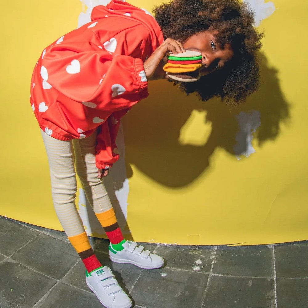 Herkesin favori atıştırmalığı şeklindeki bu lezzetli çoraplar, her kombine tatlı bir dokunuş katmak için ideal. Minikler, attıkları her adımda cheeseburger sevgilerini gösterebilir. Afiyet olsun!