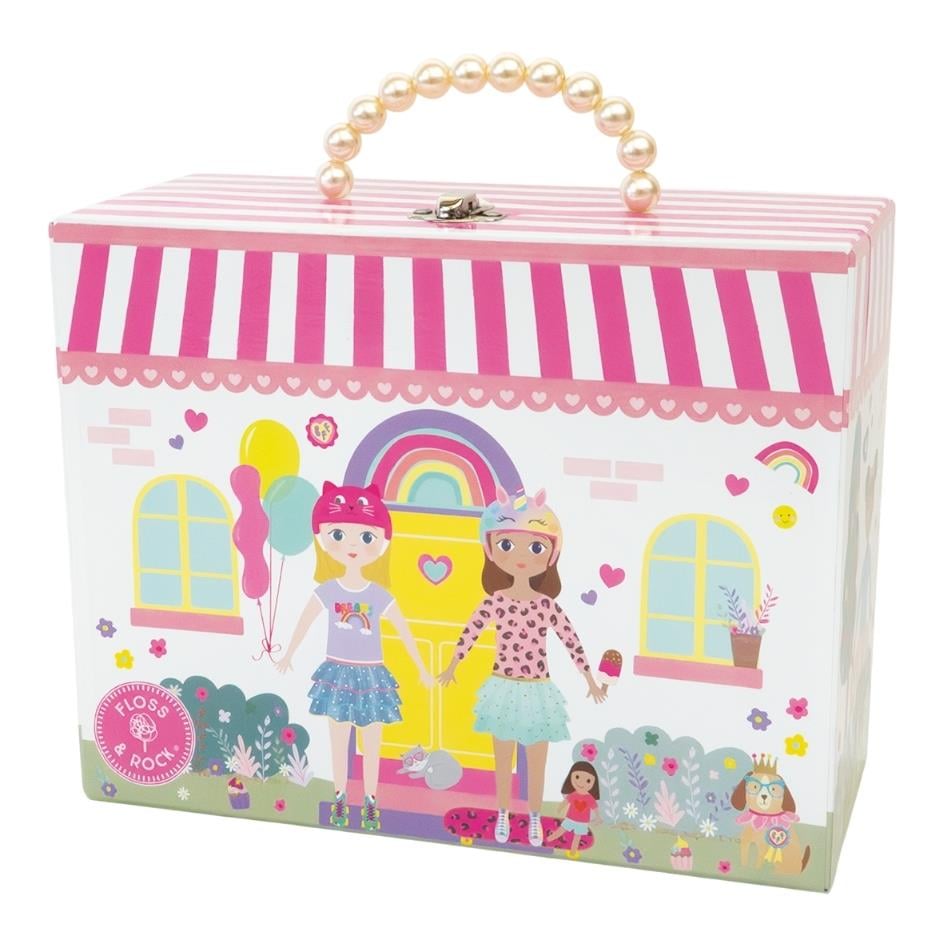 Çocukların çok sevdiği Floss & Rock çay seti 9 parçalıdır. Müzikli çay setinin içinde çaydanlık ve kapağı, 2 çay fincanı, 2 tabak ve 1 tepsiden oluşan, inci saplı, yeniden kullanılabilir taşıma çantası ile çay partilerine götürmek için mükemmel! Çaydanlığın altındaki kurma kolunu çevirin ve 'It's a small world' şarkısını dinleyin!