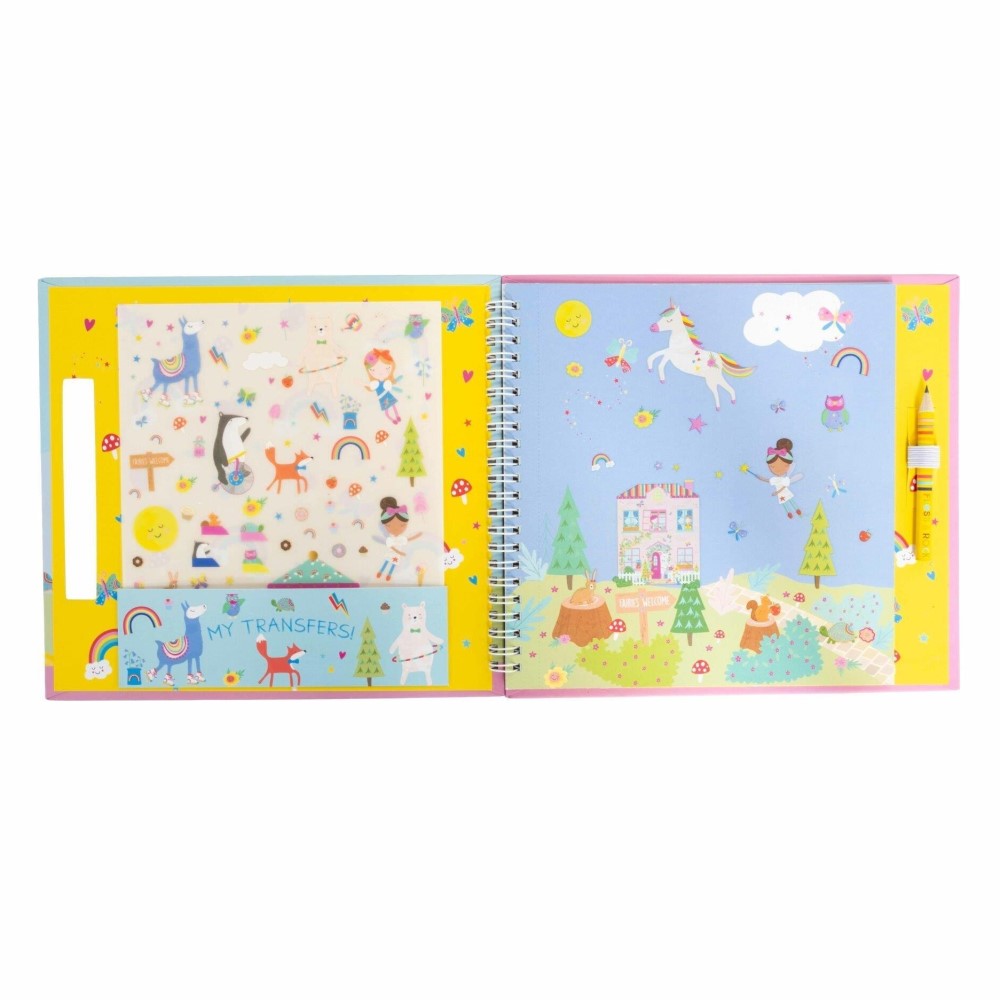 Kitabın içindeki her sayfa; gökkuşağı perileri, parıldayan yıldızlar, sevimli yaratıklar ve büyülü manzaralarla çocukların kendi hikâyelerini yaratmaları için özel olarak tasarlanmıştır. Transfer çıkartmaları sahnelere yerleştirerek eşsiz, yaratıcı ve rengârenk dünyalar oluşturmak artık çok daha eğlenceli!
