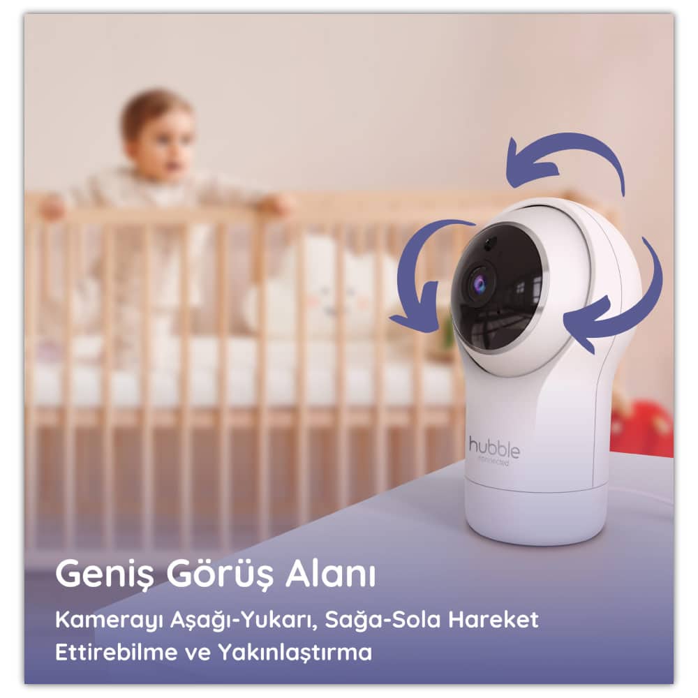 Hubble Nursery View Pro, bebeğinizin odasını her açıdan takip edebilmeniz için tasarlanmıştır. Kamerayı uzaktan sağa-sola ve yukarı-aşağı hareket ettirebilir, görüntüyü yakınlaştırabilirsiniz. Böylece bebeğinizin uyku anından odanın genel düzenine kadar her detay kontrolünüz altında olur.