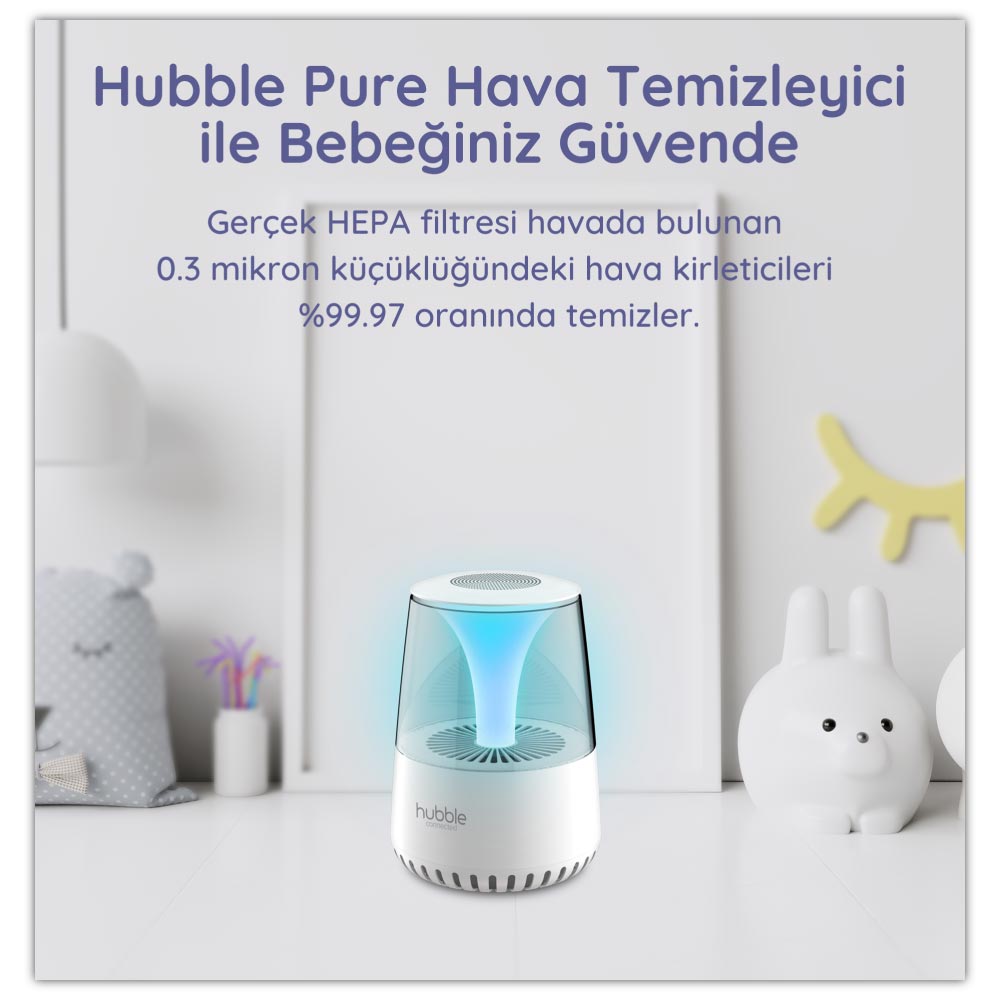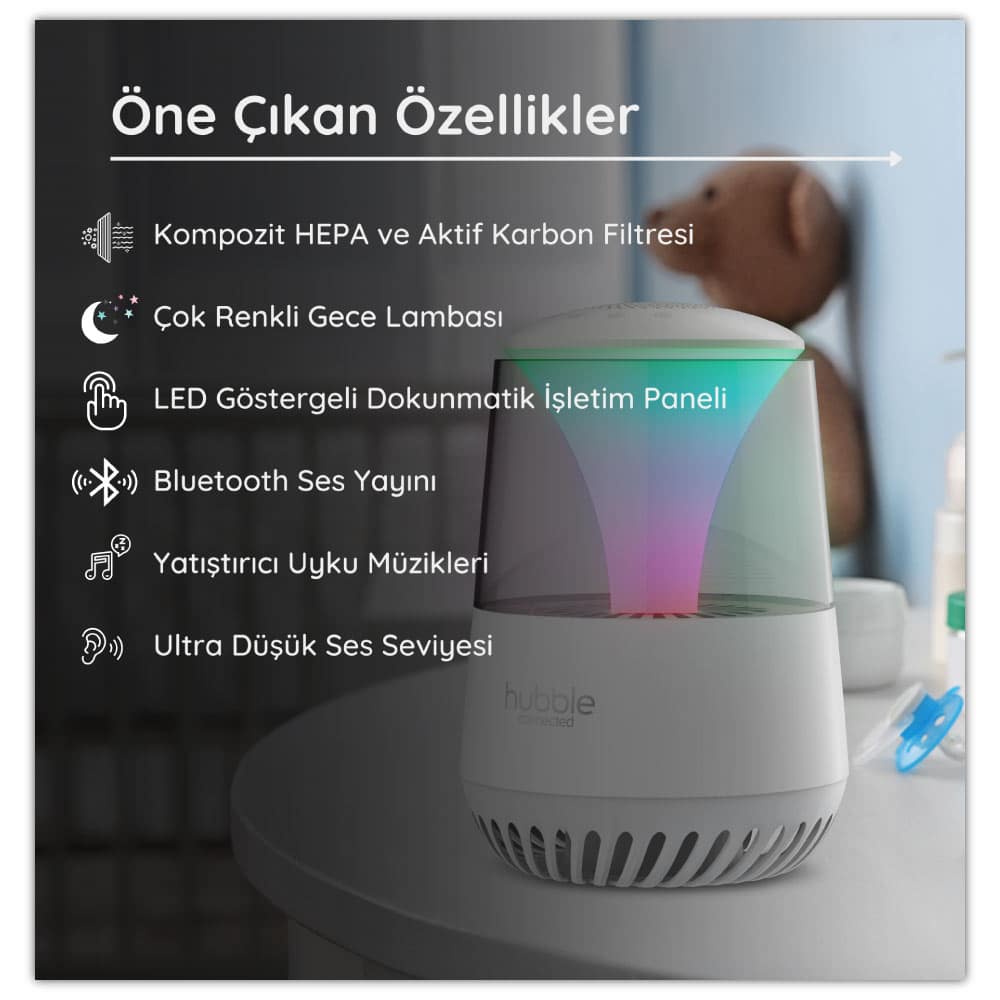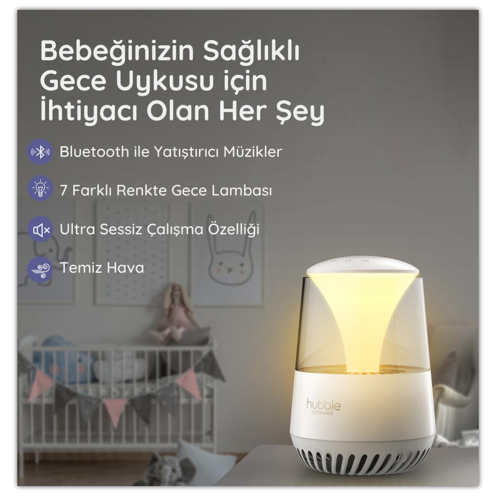 Hubble Pure, bir cihazda üç çözümü bir araya getirir: gerçek HEPA filtresi ile havayı temizler, 7 renkli gece lambasıyla huzurlu bir atmosfer oluşturur ve Bluetooth hoparlör özelliğiyle müzik – ninni – doğa sesleri çalar.