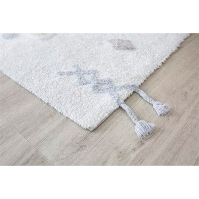 Bir tarafta üç adet el yapımı örgüsü diğer tarafta iki ponponu bulunan yumuşak beyaz tonlarda pamuk halı.
