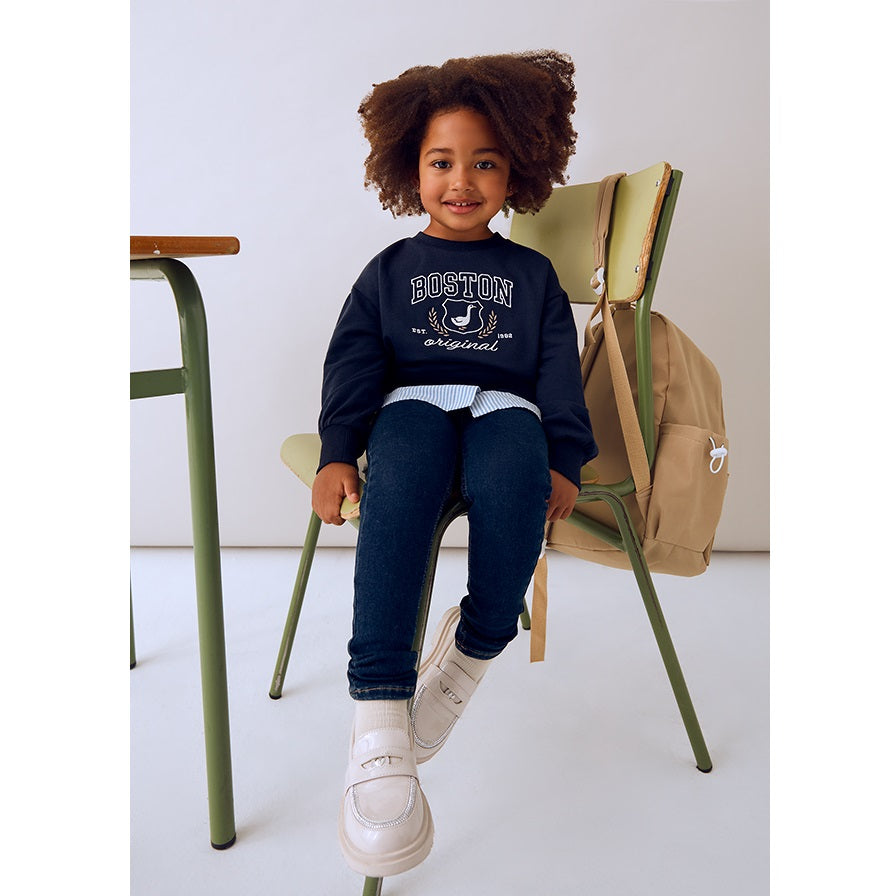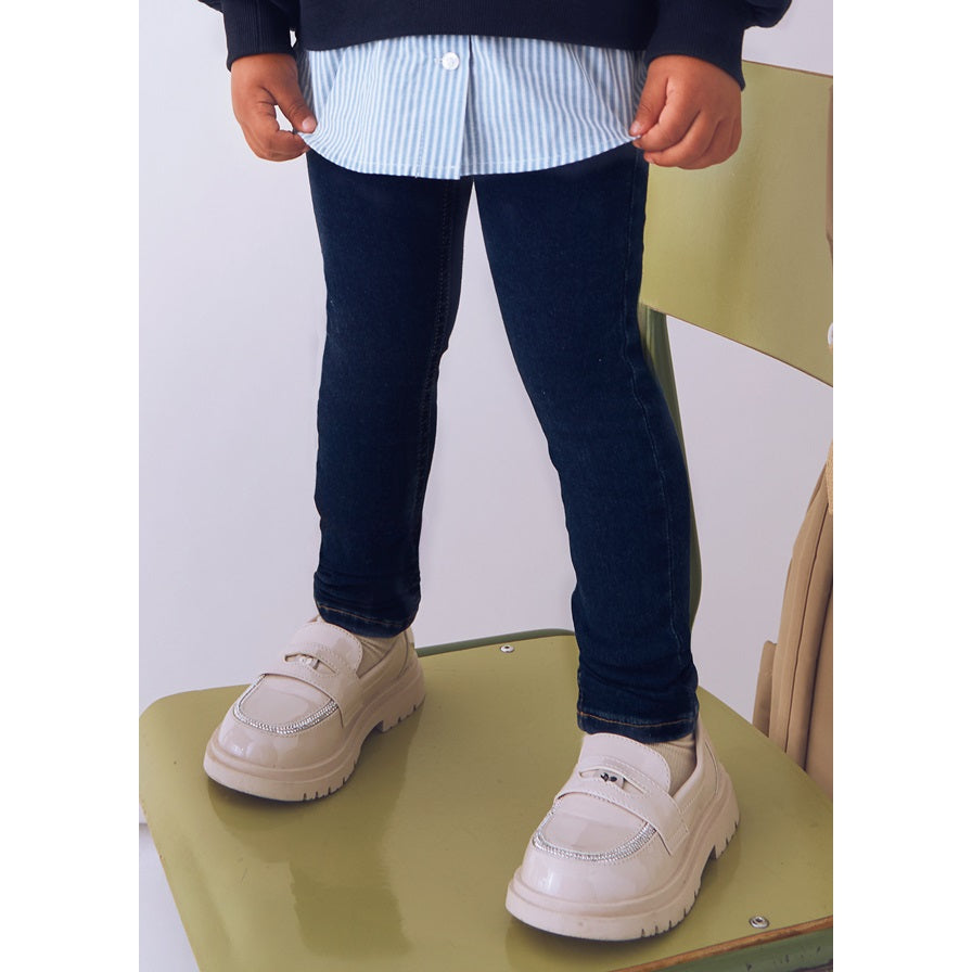 Mayoral’ın kış koleksiyonundan kız çocuk denim tayt pantolon, jean şıklığını tayt rahatlığıyla buluşturuyor. Esnek ve yumuşak yapısıyla gün boyu hareket özgürlüğü sunarken, denim görünümlü kumaşı sayesinde hem günlük kombinlerde hem de özel günlerde stil sahibi bir görünüm yaratıyor.