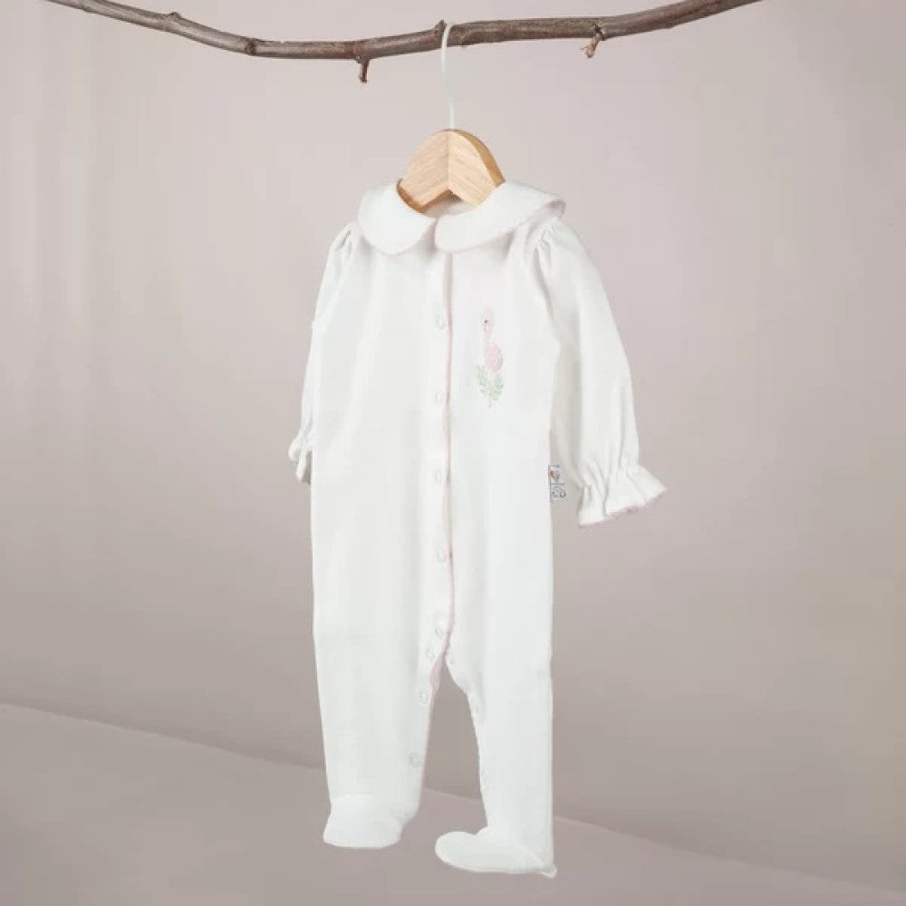 - Pembe tığ işi süslemeli flamingo nakışlı bebe yaka , kol ve bilek büzgülü, önden çıtçıtlı tulum