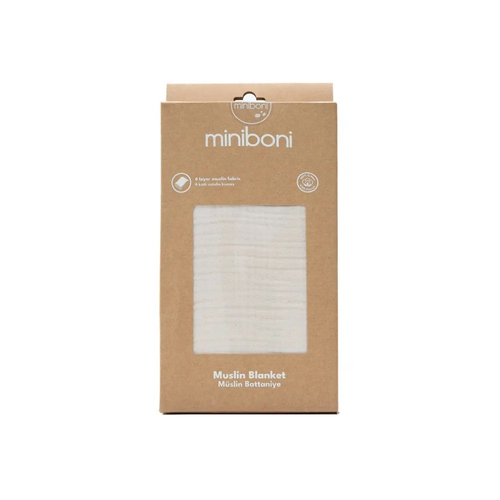 Miniboni 4 katlı müslin battaniye, bebeğinizin konforu ve sağlığı düşünülerek özenle tasarlandı. %100 pamuktan üretilen özel müslin dokusu sayesinde hem hafif hem de ekstra yumuşaktır. Kat kat hava alabilen yapısı ile terletmez, sıkmaz, sarar ve huzur verir. Bebeğinizin doğduğu andan itibaren kullanabileceğiniz bu battaniye; evde, dışarıda, arabada, parkta ya da seyahatte her an yanınızda. Annelik yolculuğunuzda size eşlik eden yumuşacık bir dost…