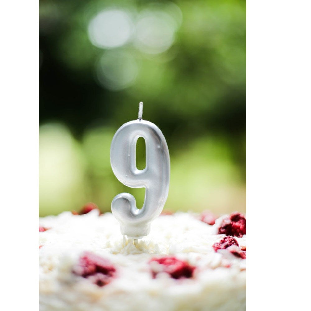 Doğum günü ve partilerde pastalarınızı süsleyecek 9 rakam gümüş renkli mum.
