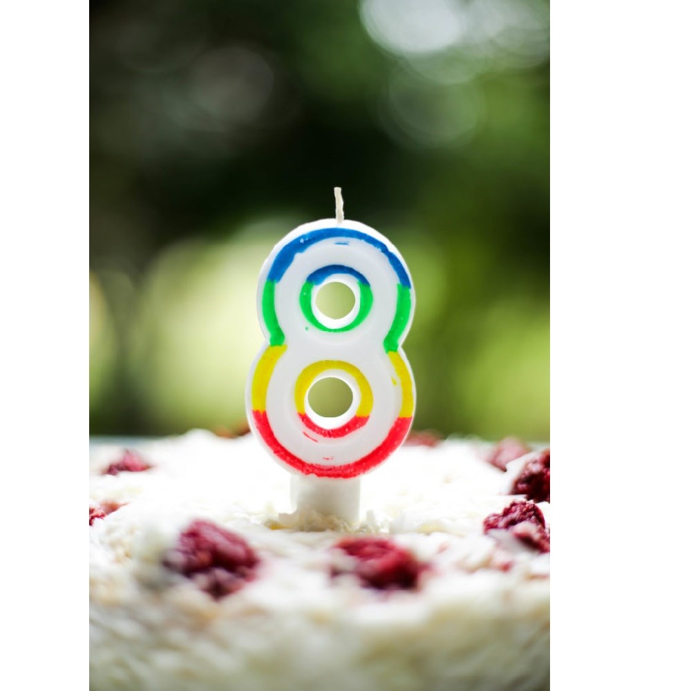 Doğum günü ve partilerde pastalarınızı süsleyecek 8 rakam beyaz kenarları renkli mum.