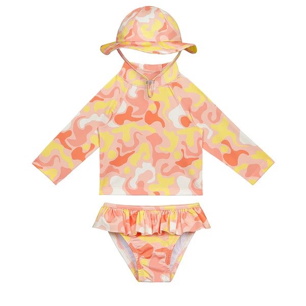 Bu 3 parçalı kız seti, SPF 50+ koruması ve çabuk kuruyan geri dönüştürülmüş polyester kumaşıyla yüzme için mükemmeldir.