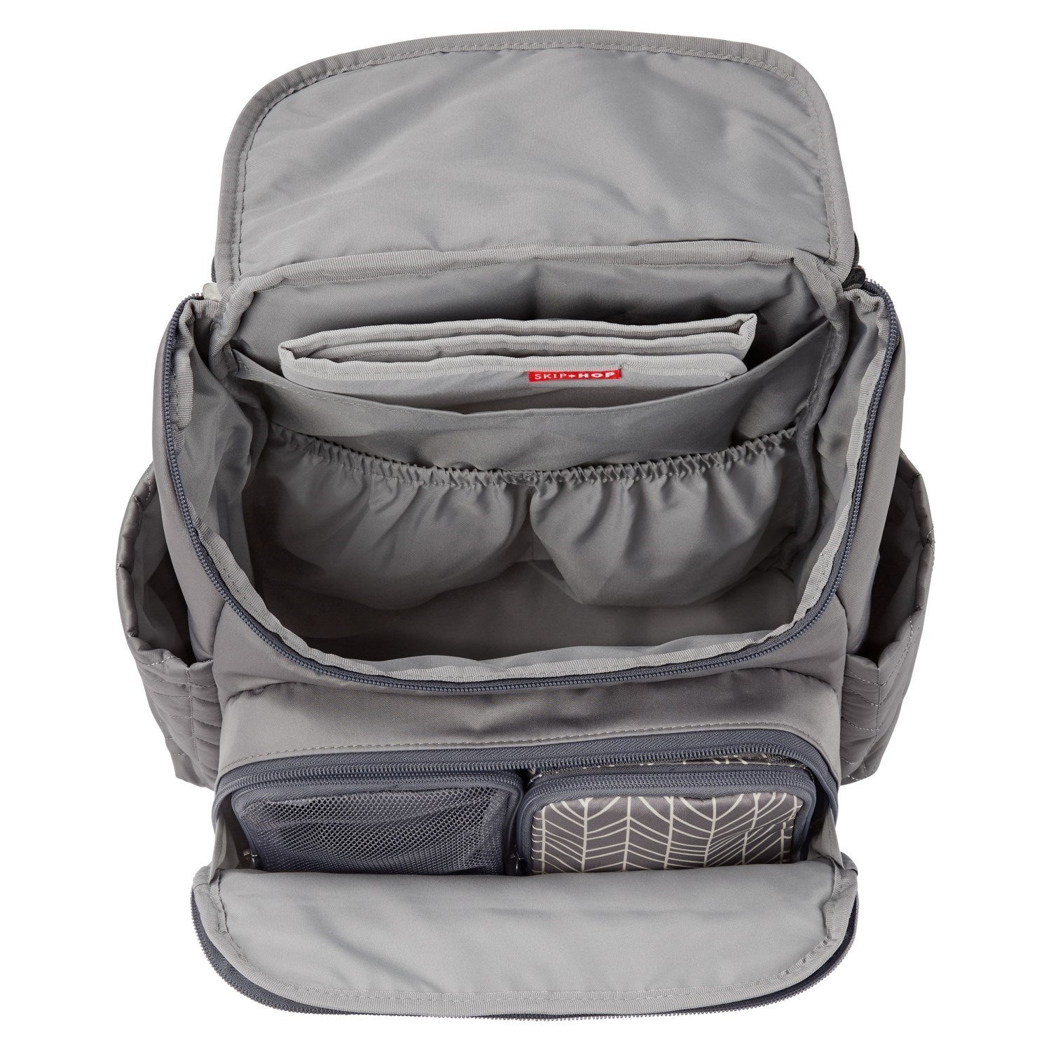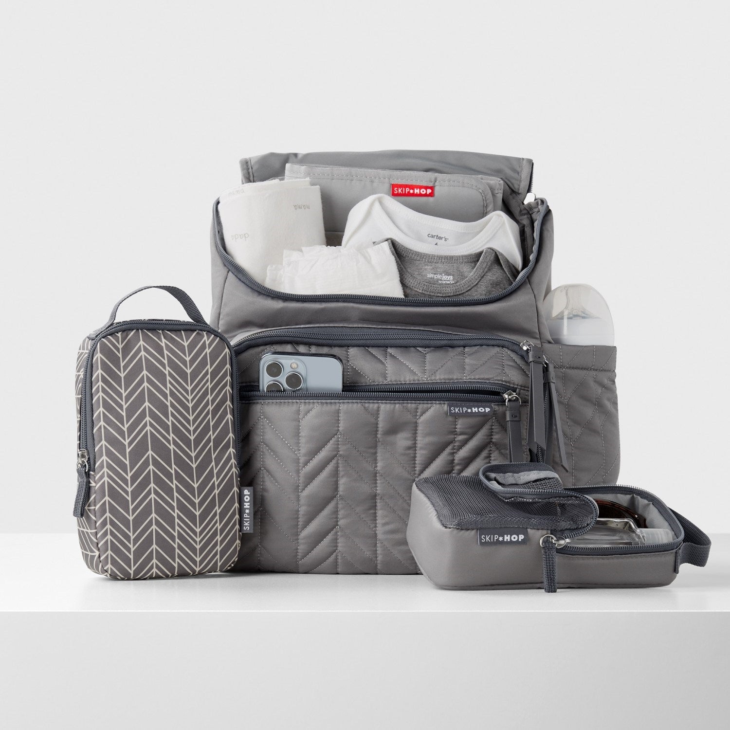 Ebeveynler için ebeveynler tarafından tasarlanan Skip Hop bebek bakım çantaları, çok sayıda bölme ve eşya gözü ile biberon, bez, mama, oyuncak ve yedek kıyafetlerin yanı sıra laptop, cep telefonu, anahtar gibi kişisel eşyalarınızı da rahatlıkla taşımanızı sağlar.