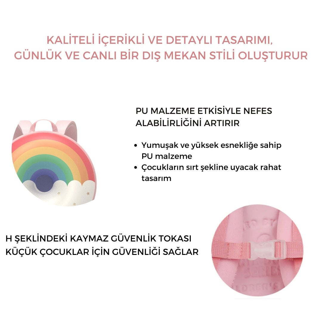 Yumuşak, ayarlanabilir ve nefes alabilen omuz askıları sayesinde çocuğunuz rahatça taşıyabilir. Kaymaz kayış ve H tokası, çantanın düşmesini engelleyerek çocuğunuzun güvenliğini sağlar. Üst sap, çantanın taşınmasına yardımcı olur ve taşıma sırasında kolaylık sağlar. Çocuğunuz için rahat, güvenli ve eğlenceli bir taşıma deneyimi sunan özel bir ürün gibi görünüyor
